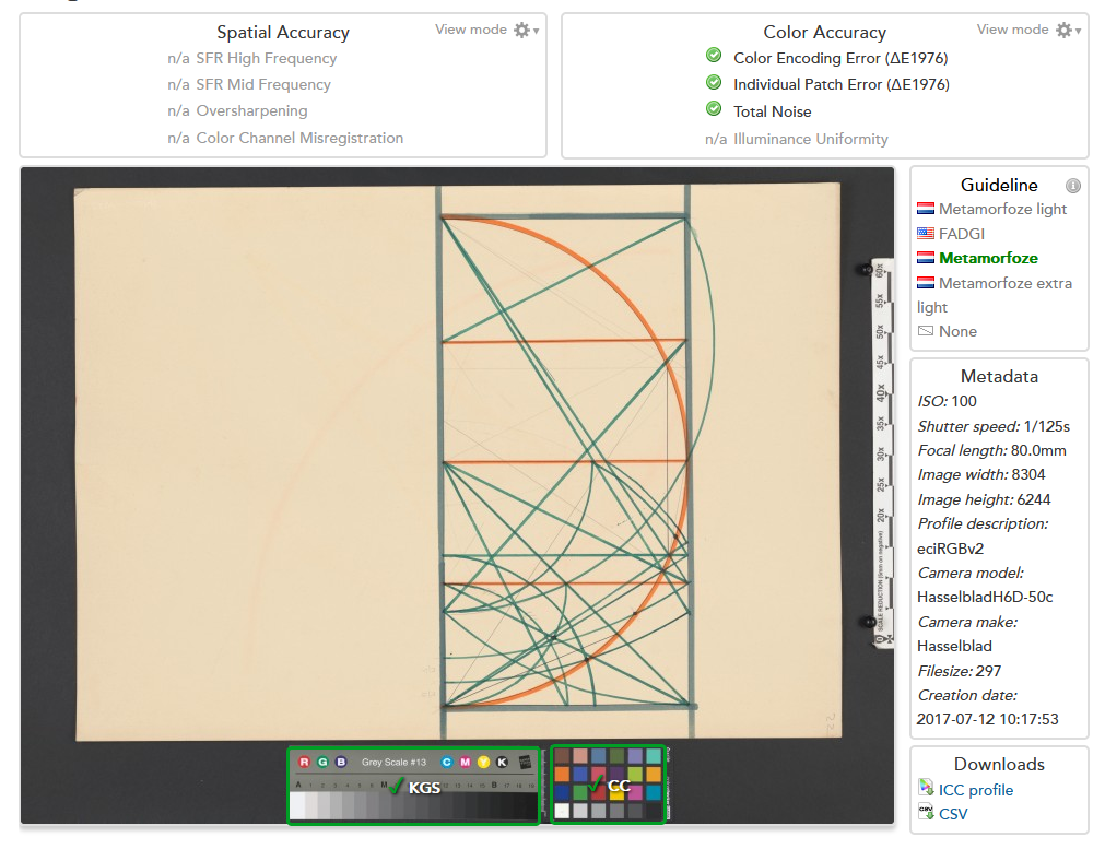 De forma a garantir um registo descritivo e rigoroso de toda a informação visível da obra de arte, a resposta do sistema digital usado é calibrada através da criação de perfis de cor específicos, com recurso a Miras Técnicas com amostras de cor medidas individualmente e certificadas por confronto com um ficheiro com valores de referência. A qualidade do perfil de cor criado pode e dever ser aferida recorrendo à reprodução de uma mira técnica diferente, capturada nas mesmas condições. Os resultados obtidos são confrontados com os valores expectáveis, atestando que as diferenças estão dentro das tolerâncias admitidas pelo normativo internacional aplicável à reprodução de património.