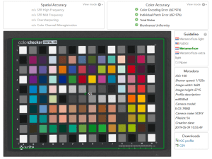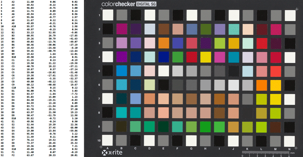 Mira para calibração e linearização da resposta do sensor: 140 amostras de cor e respectivo ficheiro de referência. (© X-rite)