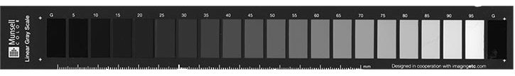 Munsell linear Gray Scale: para verificação da consistência da exposição e contraste ao longo de uma sessão.